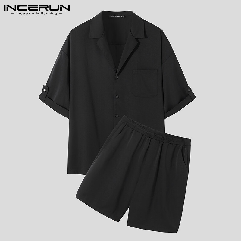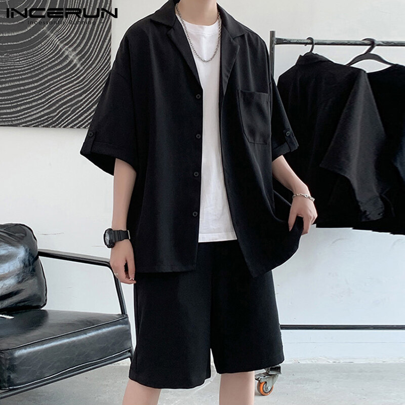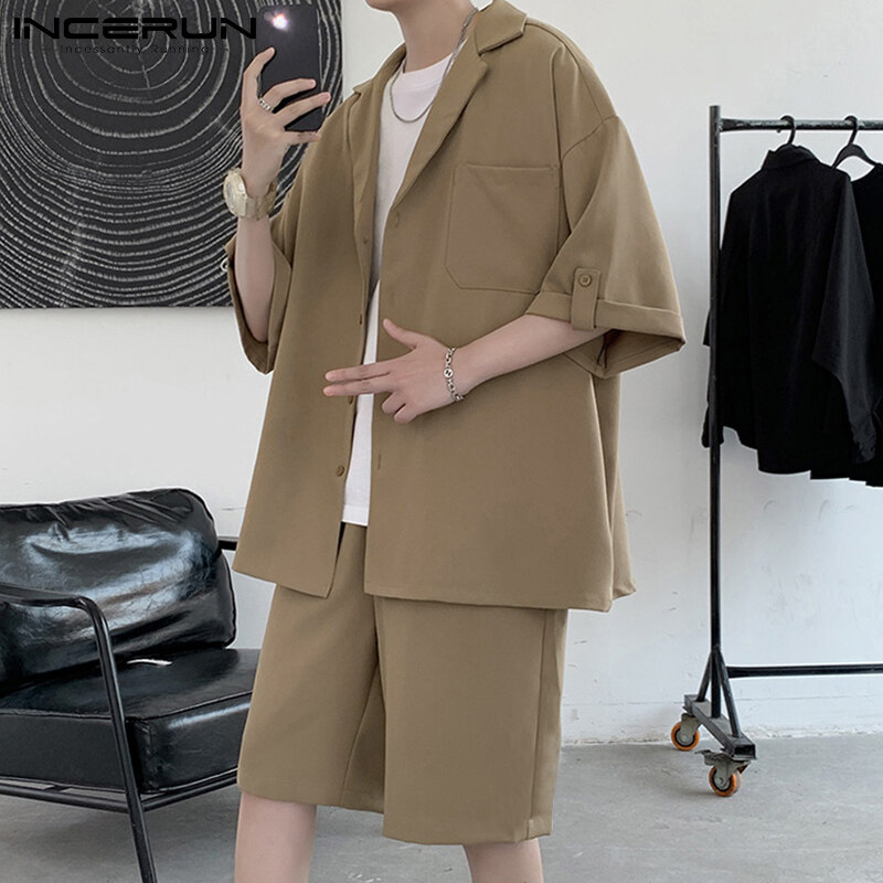 INCERUN男式短袖韩式休闲西装纽扣衬衫弹性腰间短裤套装(韩式)
